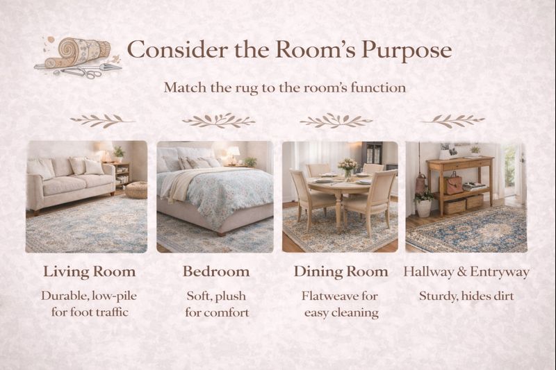 Each space has different needs, so always match the rug to the room’s function.
