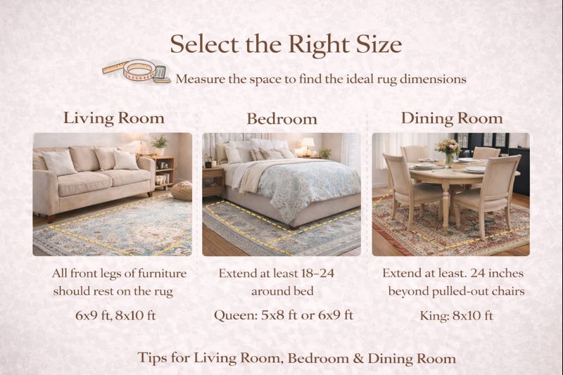 • Rug should extend at least 18–24 inches around the bed
