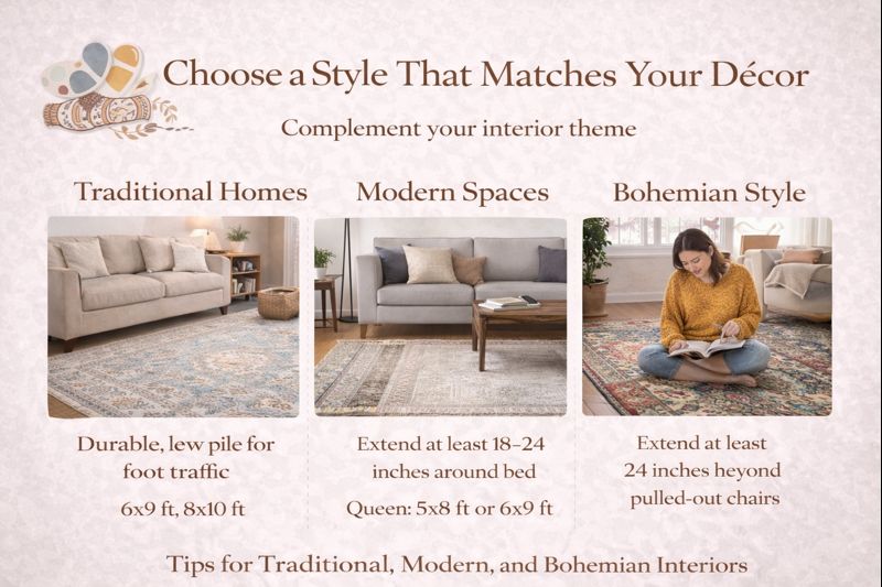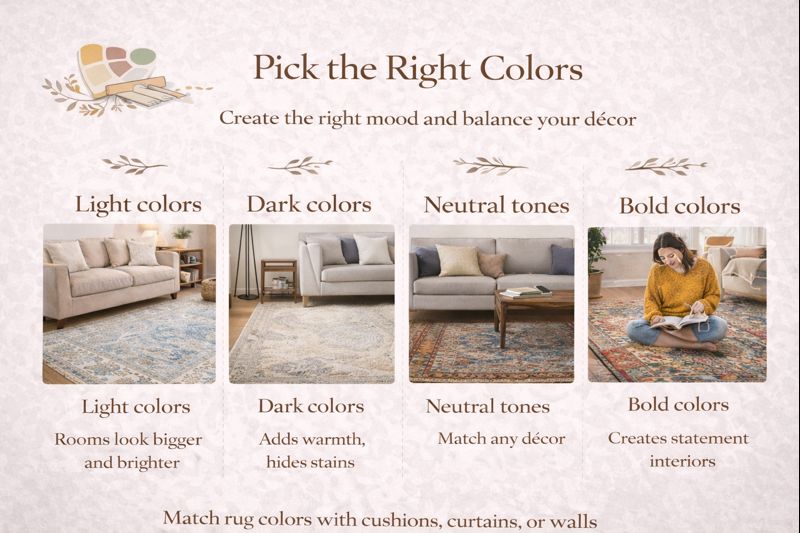 Try to match rug colors with cushions, curtains, or wall tones for a balanced look.