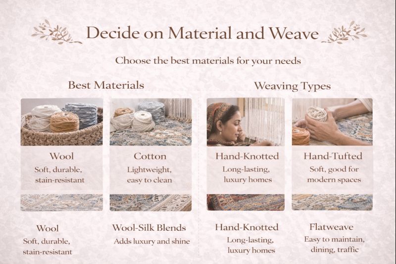 • Living Room: Choose durable rugs that can handle daily foot traffic. Hand-knotted or low-pile rugs work best.