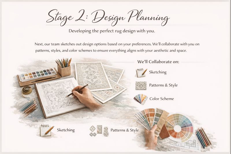 At this stage, we turn your ideas into real design concepts. Our designers prepare sketches and visual layouts based on your taste, room style, and functional needs. Together, we finalize patterns, textures, and color combinations so the rug feels perfectly made for your space.