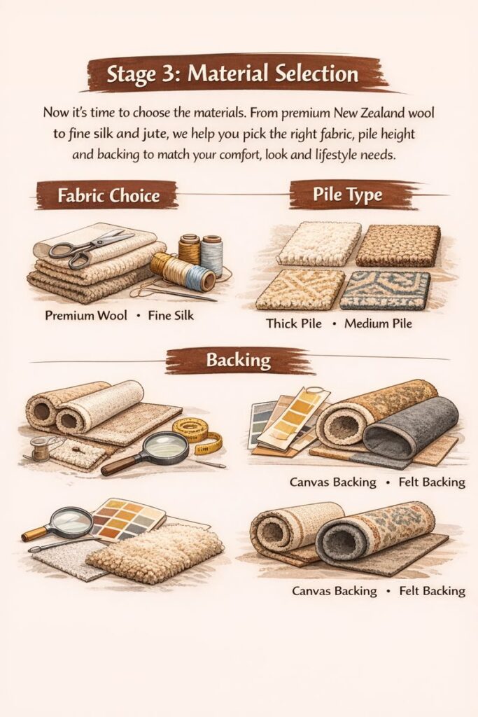 • Fabric Choice: Selecting fibers that balance softness, strength, and visual appeal, based on how and where the rug will be used.